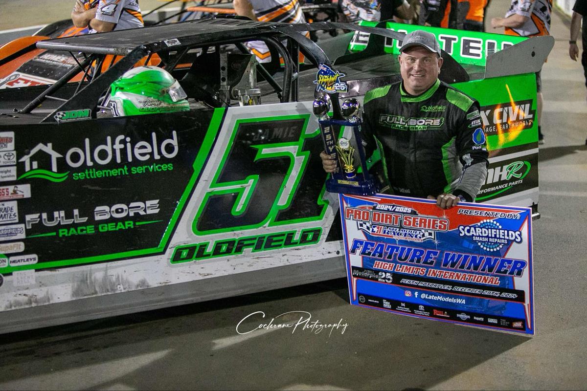 It was a marathon feature race tonight at the Perth Motorplex, but when all was said and done, it was Jamie Oldfield (Oldfield Racing) who did enough to claim his second feature race win for the season in what was Round Eight of the Pro Dirt Series, proudly presented by the team at Scardifield Smash Repairs!